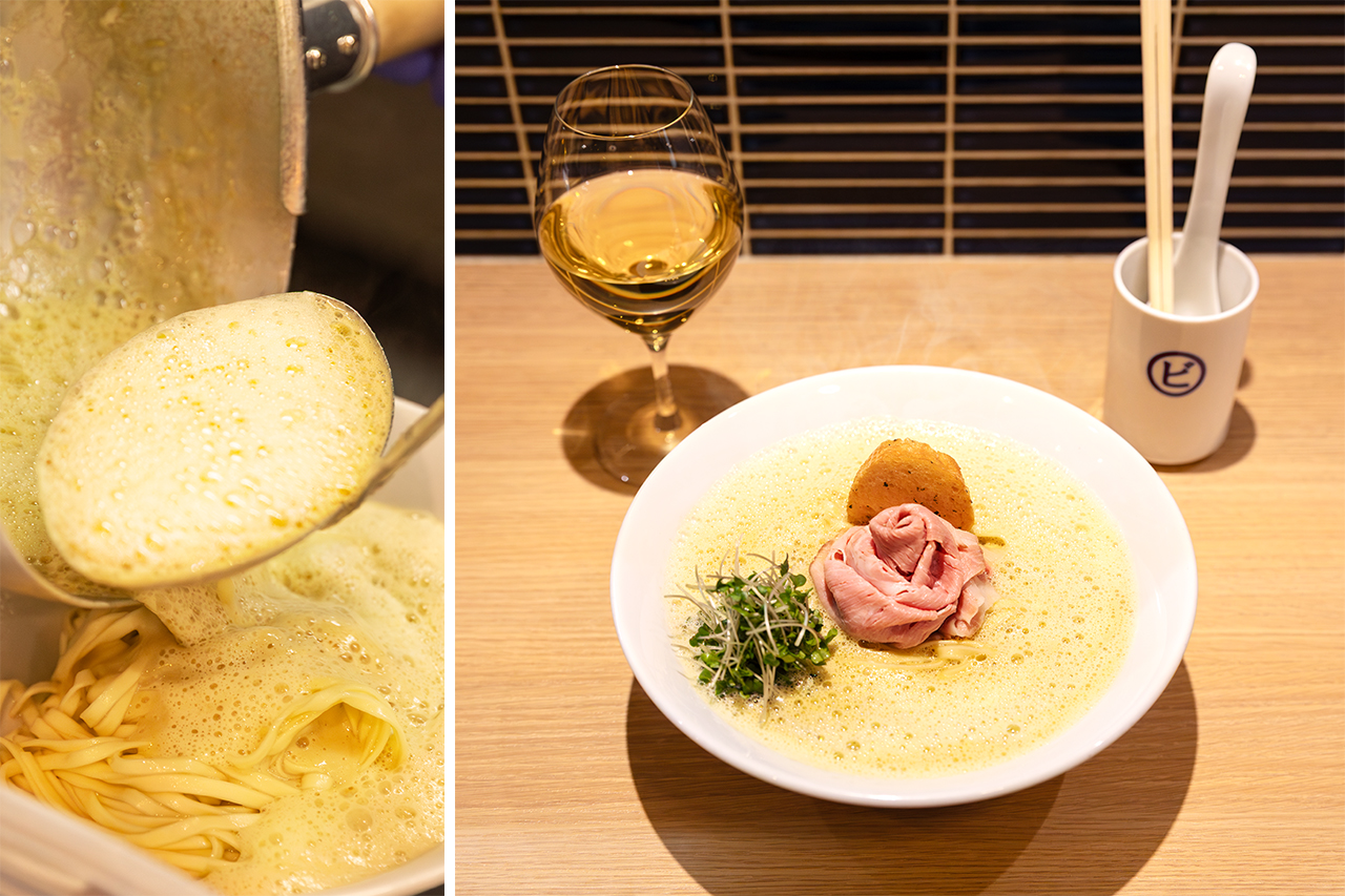 鯛を長時間煮込んだ白湯スープをベースに、ソース状のあさりやチーズを合わせた洋風ラーメン。さらに表面には泡状のエスプーマのような仕上げも施されている。クリーミーな鯛白湯にあさりの旨味がしっかり溶け込み、チーズのコクが後から広がる、優しくも満足感のある味わいとなっている。