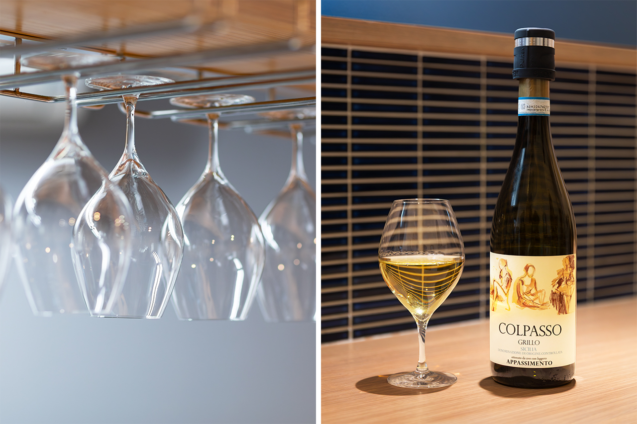 「グラスワイン 税込850円」。イタリアシチリア島のワイン『COLPASSO』(コルパッソ)を使用。はじめの一口はフルーティーな甘み、後半には柑橘のような爽やかさがふわりと広がる。