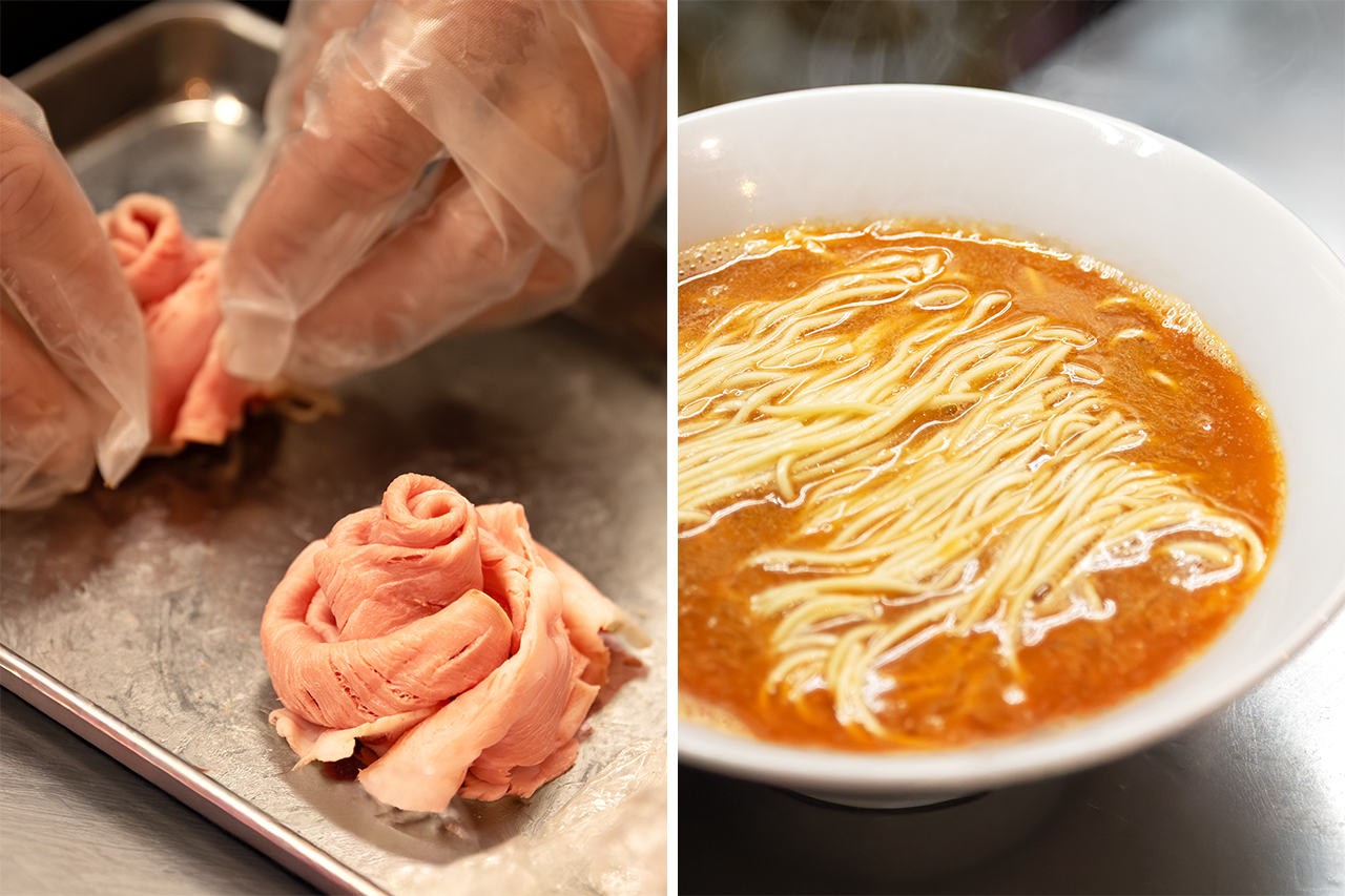 バラの形に仕立てたチャーシュー、泡状に仕上げたスープ、オマール海老の鮮やかなオレンジ色——視覚的にも美しい一杯を追求してきた。